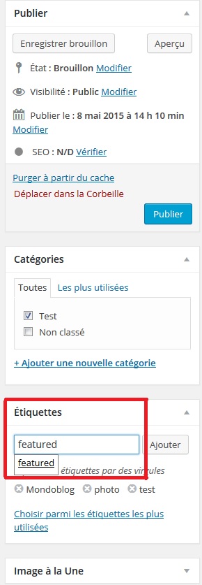 Pour qu’un billet s’ajoute au carrousel déroulant comme ici (le slider où défilent les articles), il faut lui attribuer l’étiquette (ou le tag) Featured, avant de cliquer sur « Publier ».