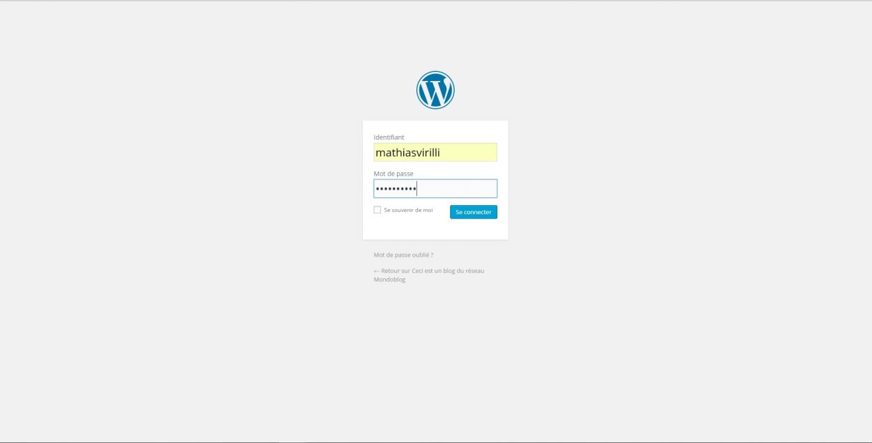 Une fois que vous avez votre identifiant et votre mot de passe, rendez-vous sur votre blog. Vous avez dû recevoir un mail à cet effet vous invitant à confirmer l’invitation puis à vous connecter avec l’adresse de votre blog, à laquelle vous ajoutez /wp-admin. Par exemple :