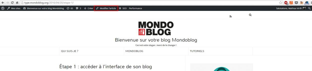 Si vous pensez avoir assimilé l’essentiel de ce premier article, vous pouvez le dépublier pour qu’il ne s’affiche plus sur votre blog. Pour cela, cliquez sur le bouton « Modifier l’article » dans la barre d’accès à votre interface.
