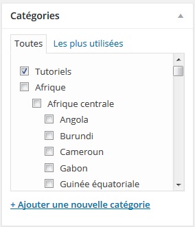 a) Les catégories permettent de ranger votre blog en classant vos articles par thématique. Par exemple, « politique », « économie », « culture », « technologies ». Vous pouvez « Ajouter une nouvelle catégorie » si le thème de votre article ne correspond pas à une catégorie pré-existante. Il est cependant important de garder un nombre raisonnable de catégories (une vingtaine max).