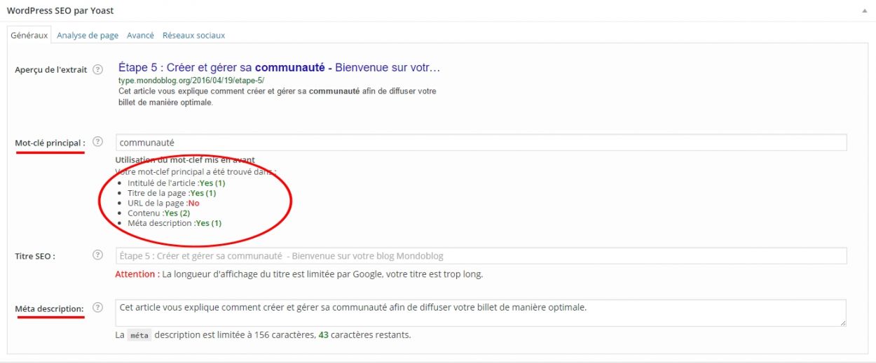 c) le référencement « WordPress SEO » sert, quand il est bien fait, à faire remonter votre site dans les résultats des moteurs de recherche. Il est un indicateur de la cohérence de votre billet en termes de référencement, puisqu’il fait la synthèse du titre de l’article, de l’URL, du corps du texte et de la méta-description à partir du « Mot-clé principal » renseigné. Choisissez donc un mot (et un seul!), de façon à ce que le maximum de critères soient au vert.